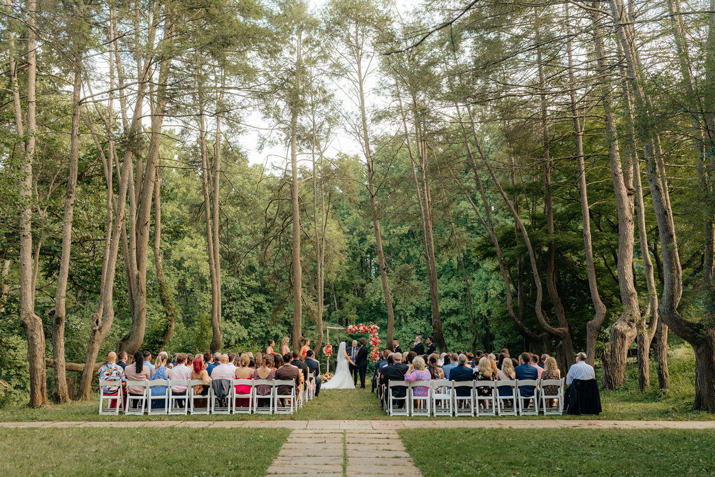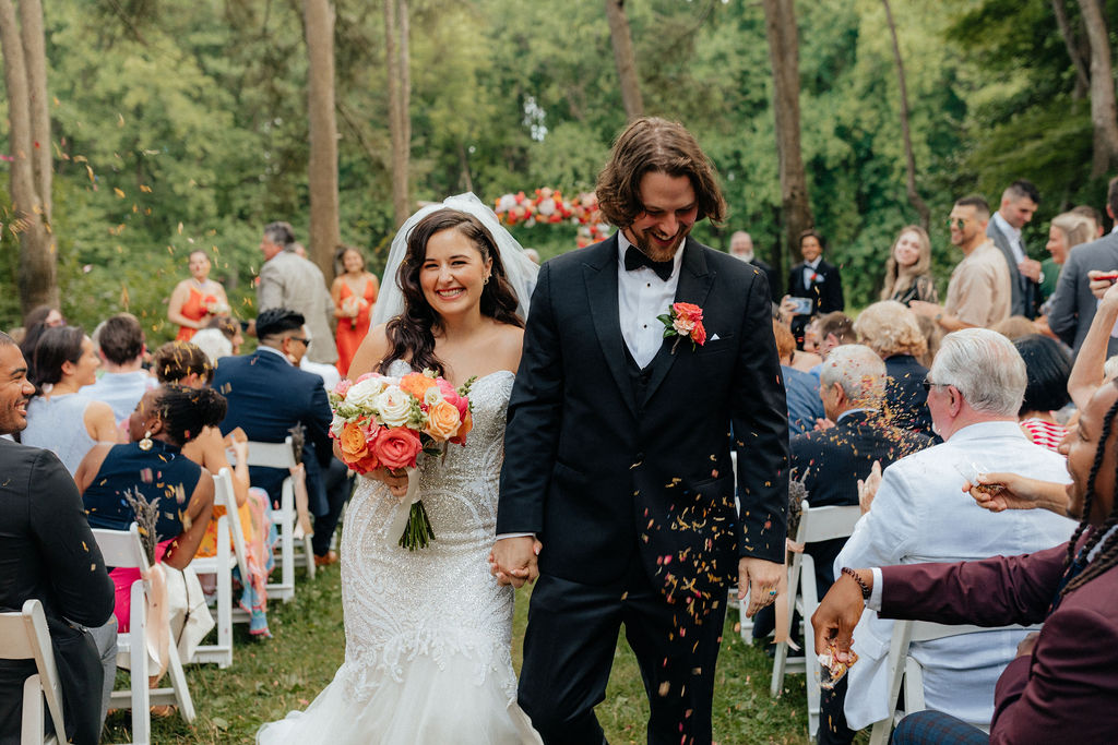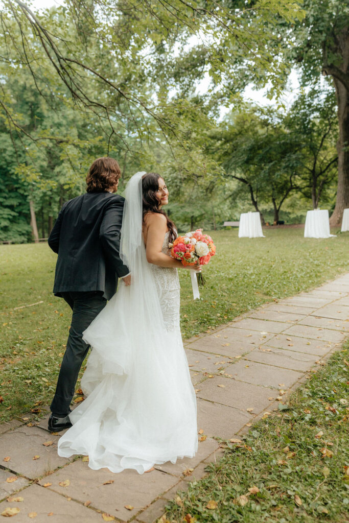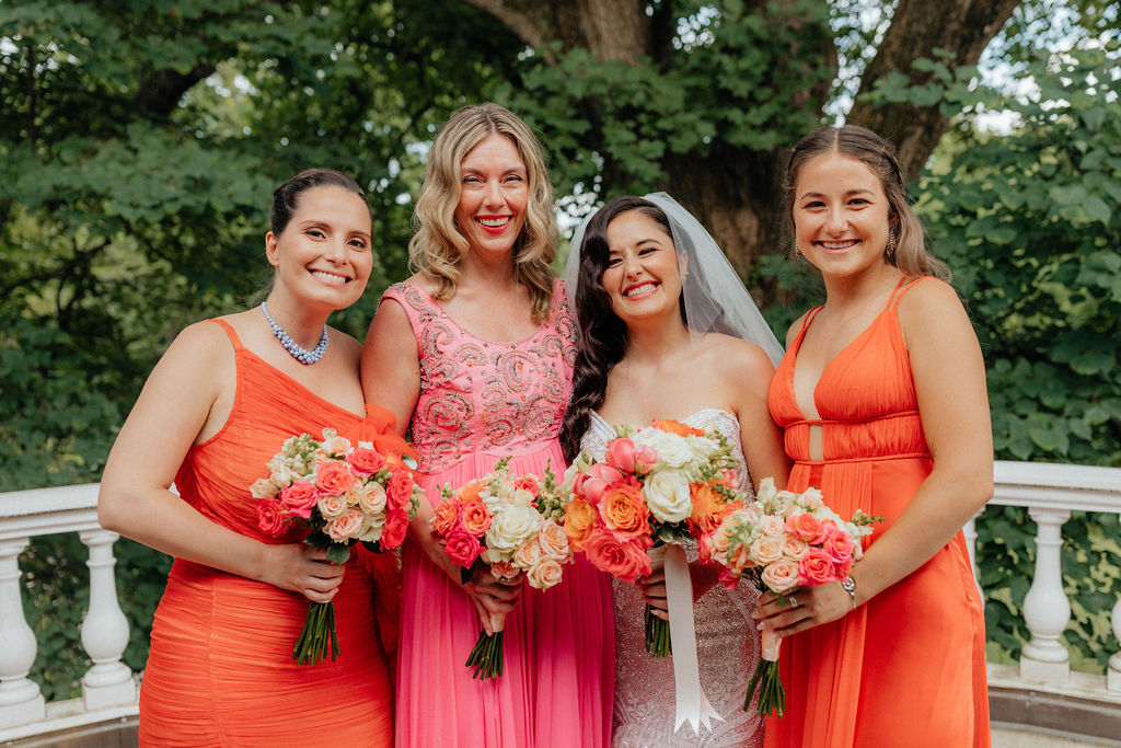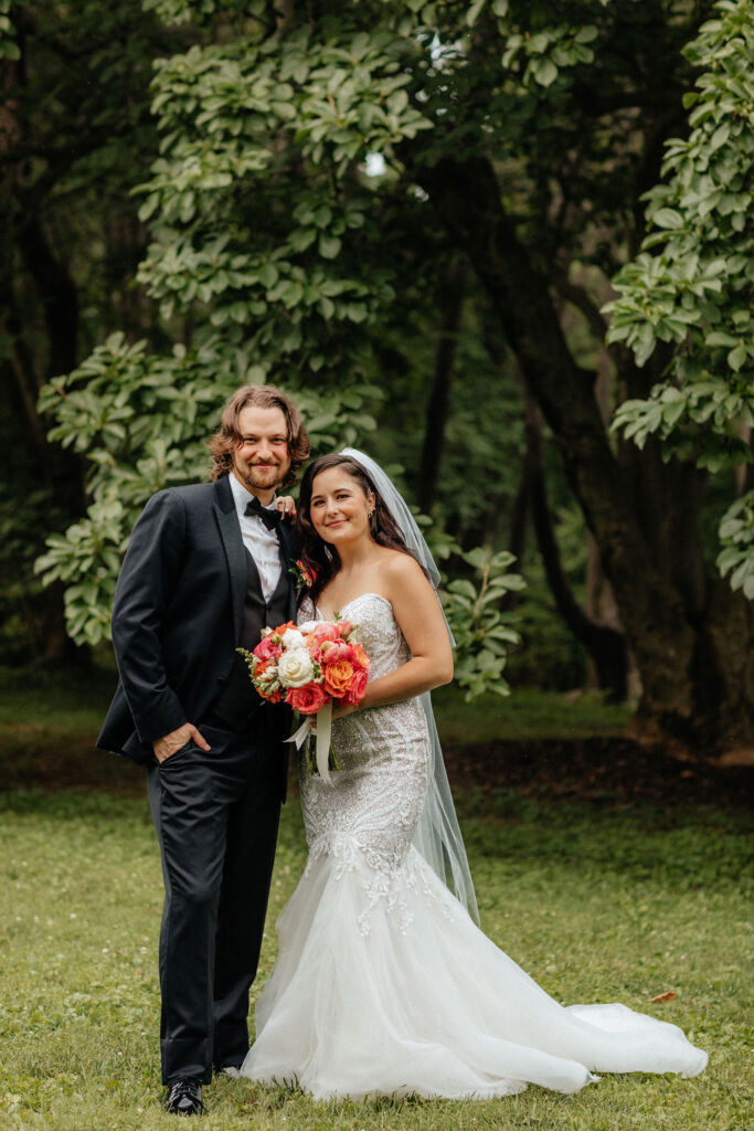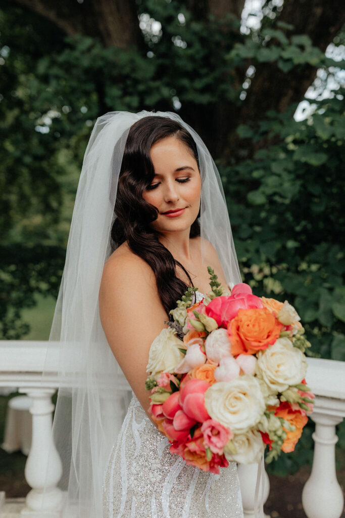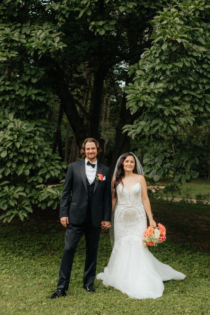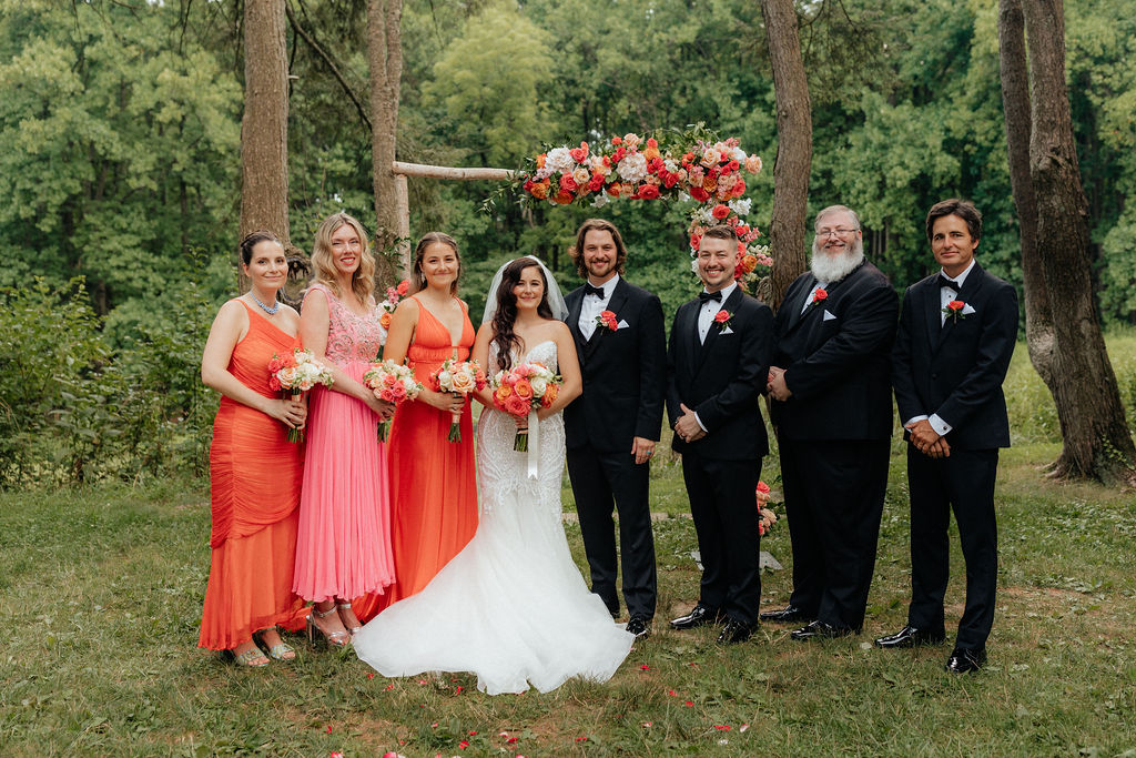 Eva and Sam’s Woodend Sanctuary & Mansion wedding was a gorgeous summer day full of friends, love, and vibrant colors. It was a hot day, but despite the changing weather outlook we were able to have the ceremony outside. The outdoor ceremony location is gorgeous among all the mature trees on the property and made for stunning photos. The bright florals in shades of pinks, whites, and oranges made their own statement while not distracting from the gorgeous grounds.