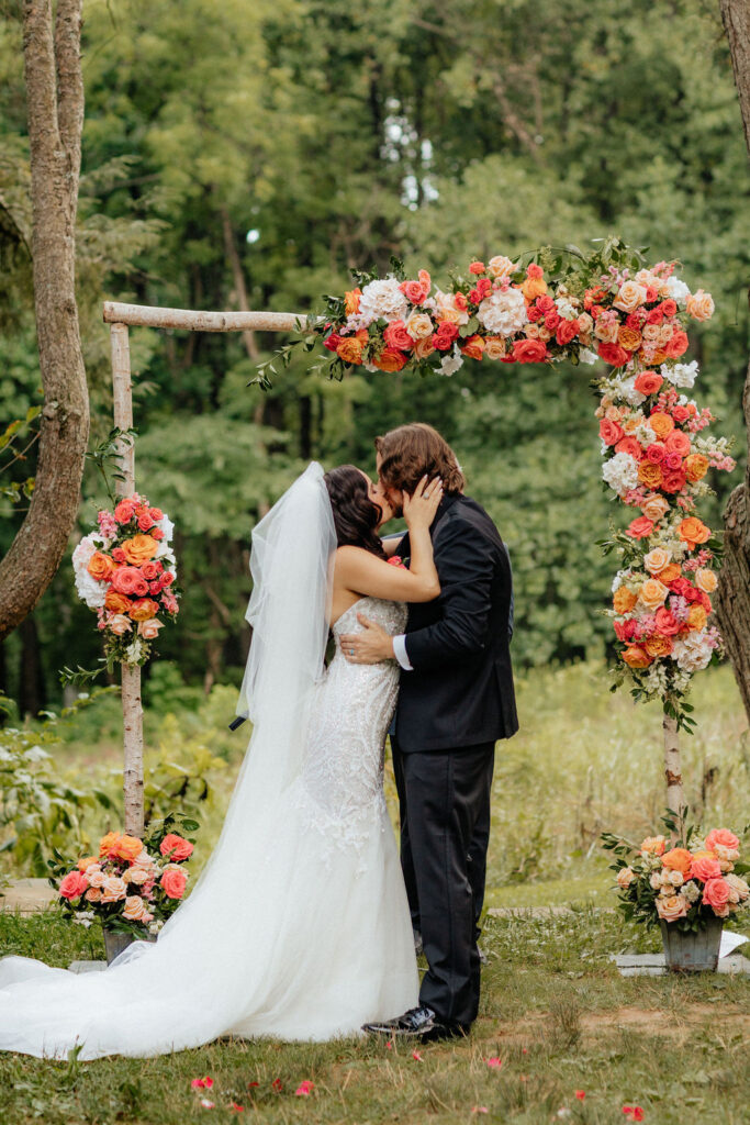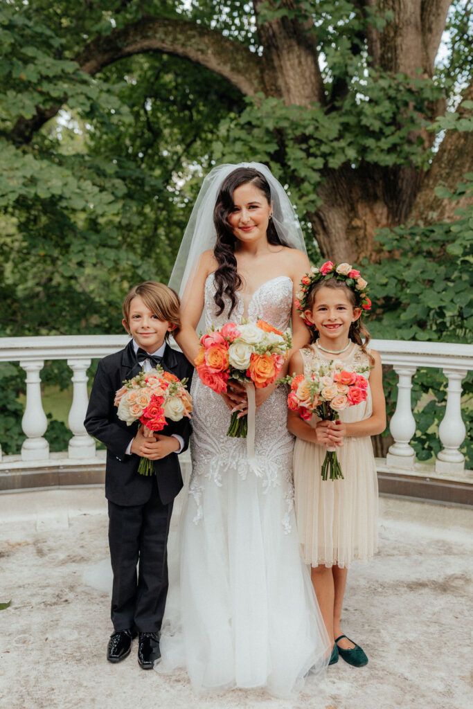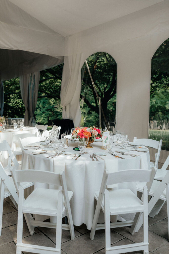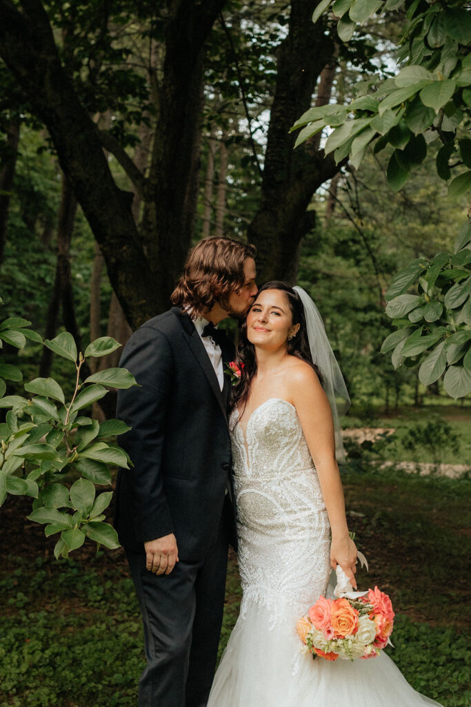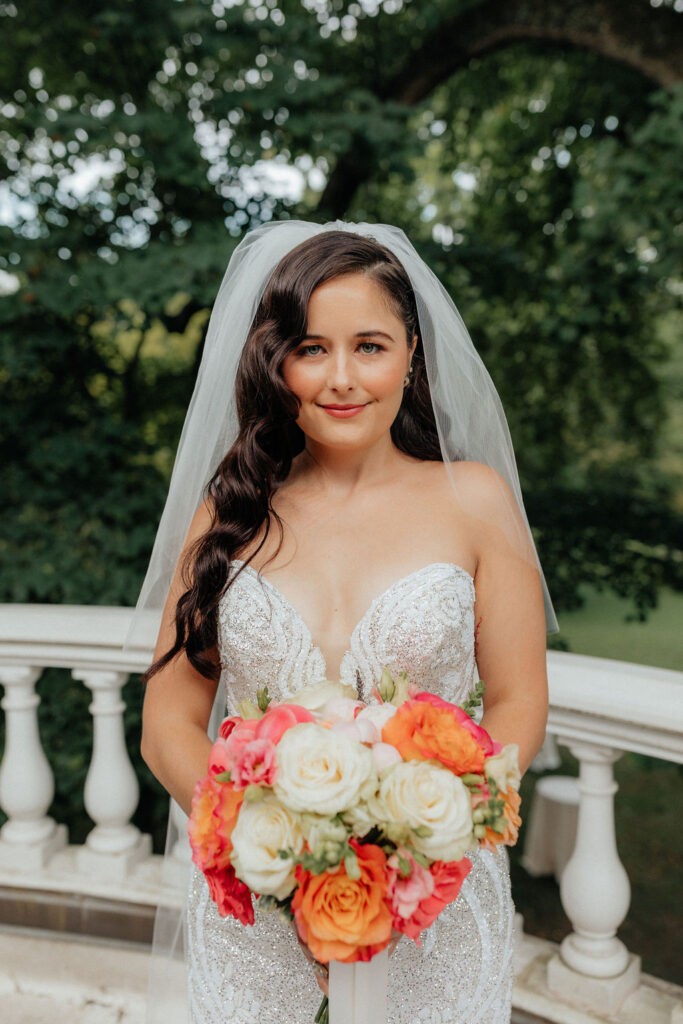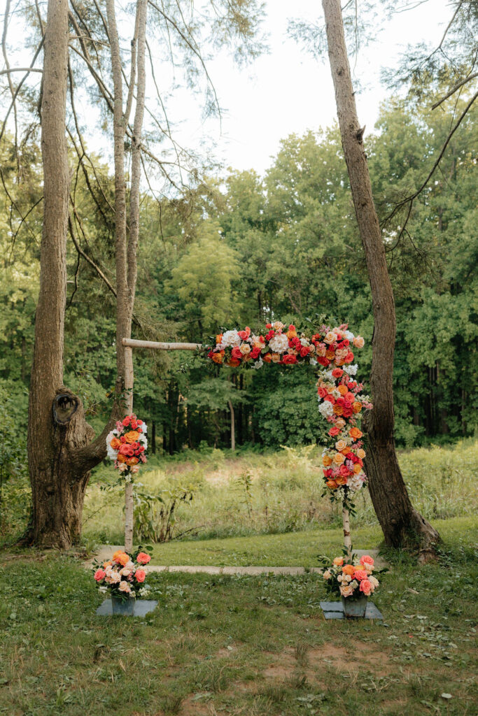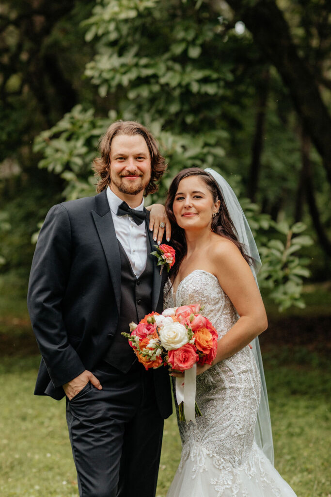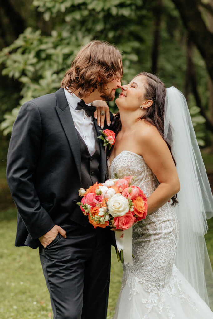 Eva and Sam’s Woodend Sanctuary & Mansion wedding was a gorgeous summer day full of friends, love, and vibrant colors. It was a hot day, but despite the changing weather outlook we were able to have the ceremony outside. The outdoor ceremony location is gorgeous among all the mature trees on the property and made for stunning photos. The bright florals in shades of pinks, whites, and oranges made their own statement while not distracting from the gorgeous grounds.