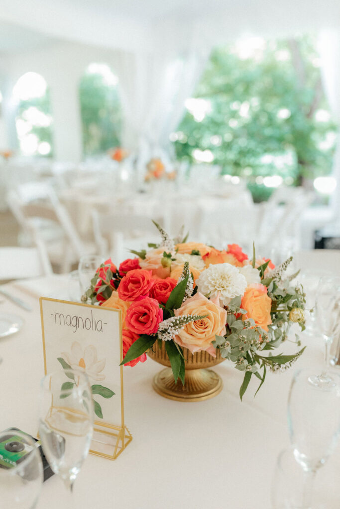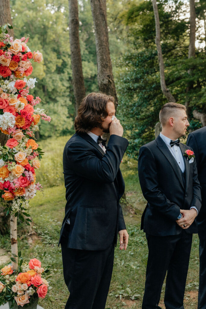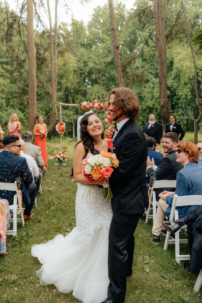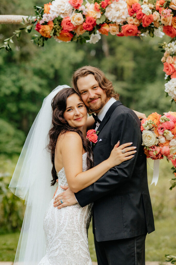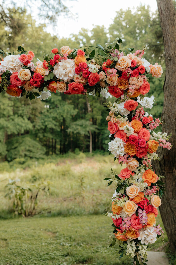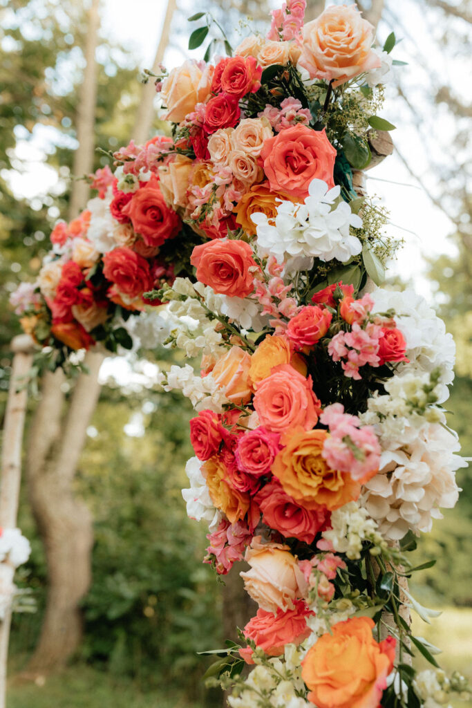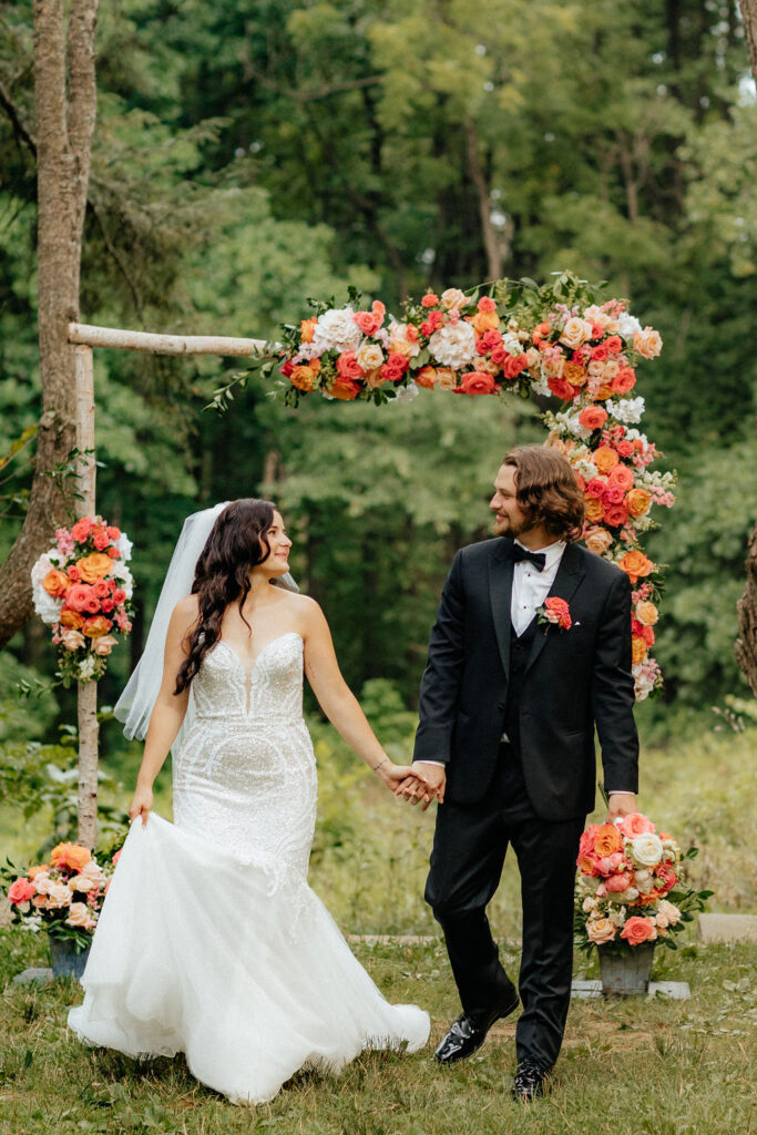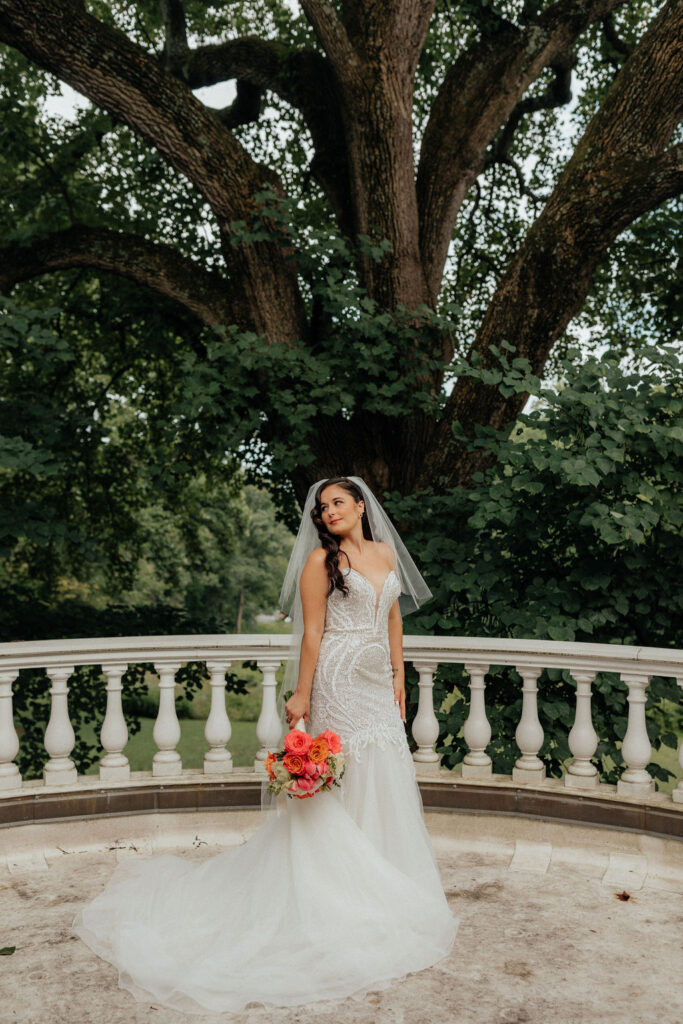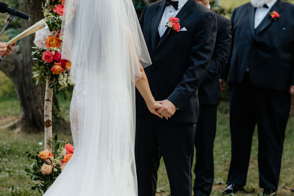 Eva and Sam’s Woodend Sanctuary & Mansion wedding was a gorgeous summer day full of friends, love, and vibrant colors. It was a hot day, but despite the changing weather outlook we were able to have the ceremony outside. The outdoor ceremony location is gorgeous among all the mature trees on the property and made for stunning photos. The bright florals in shades of pinks, whites, and oranges made their own statement while not distracting from the gorgeous grounds.