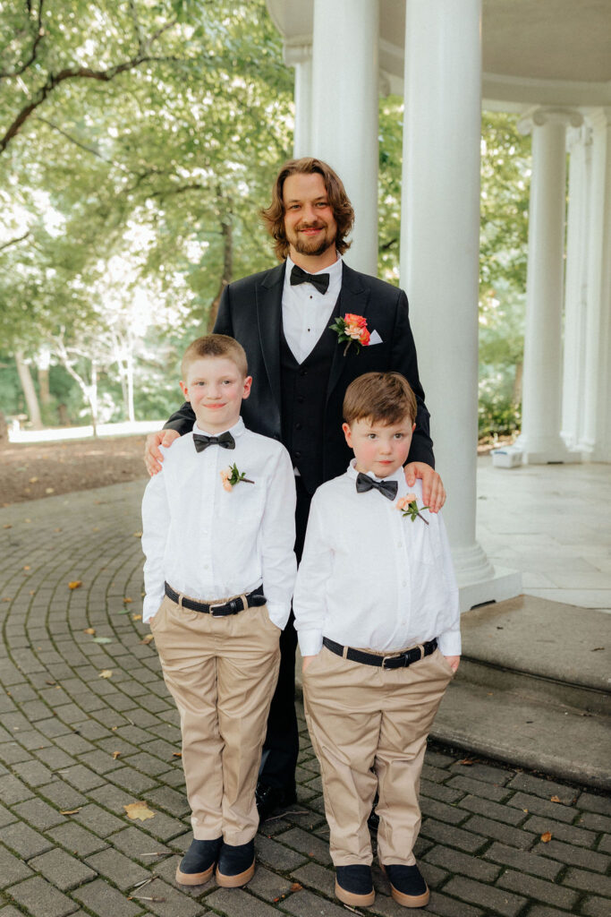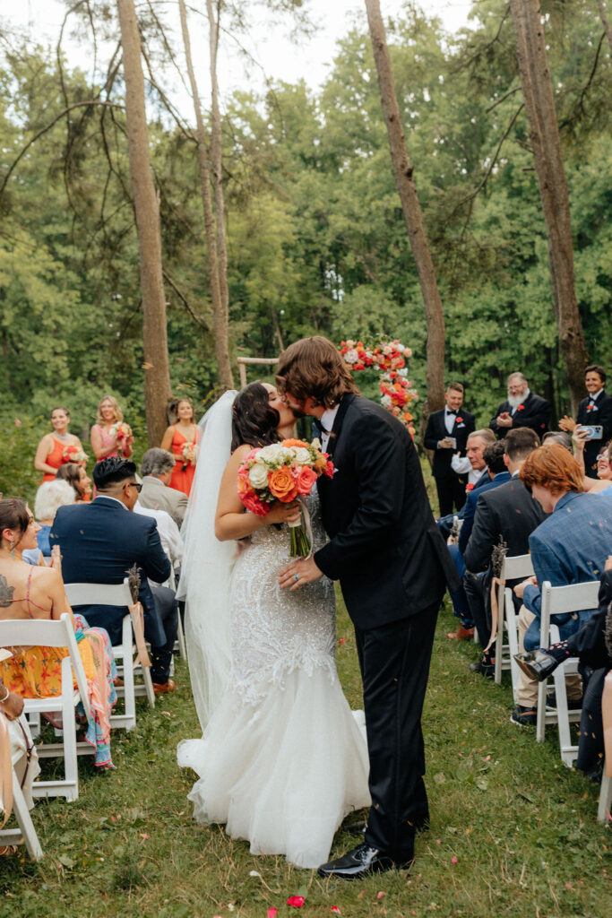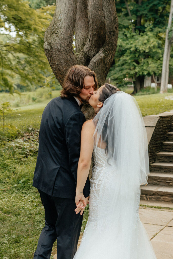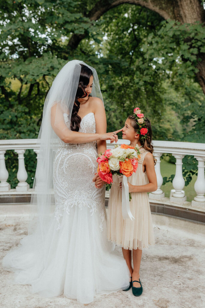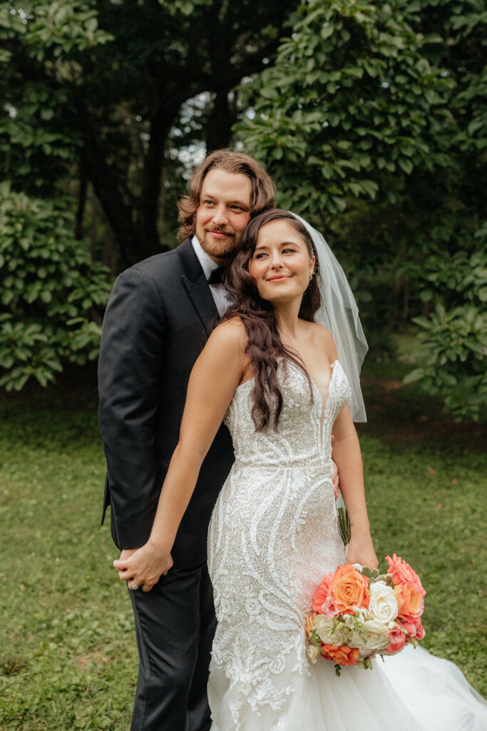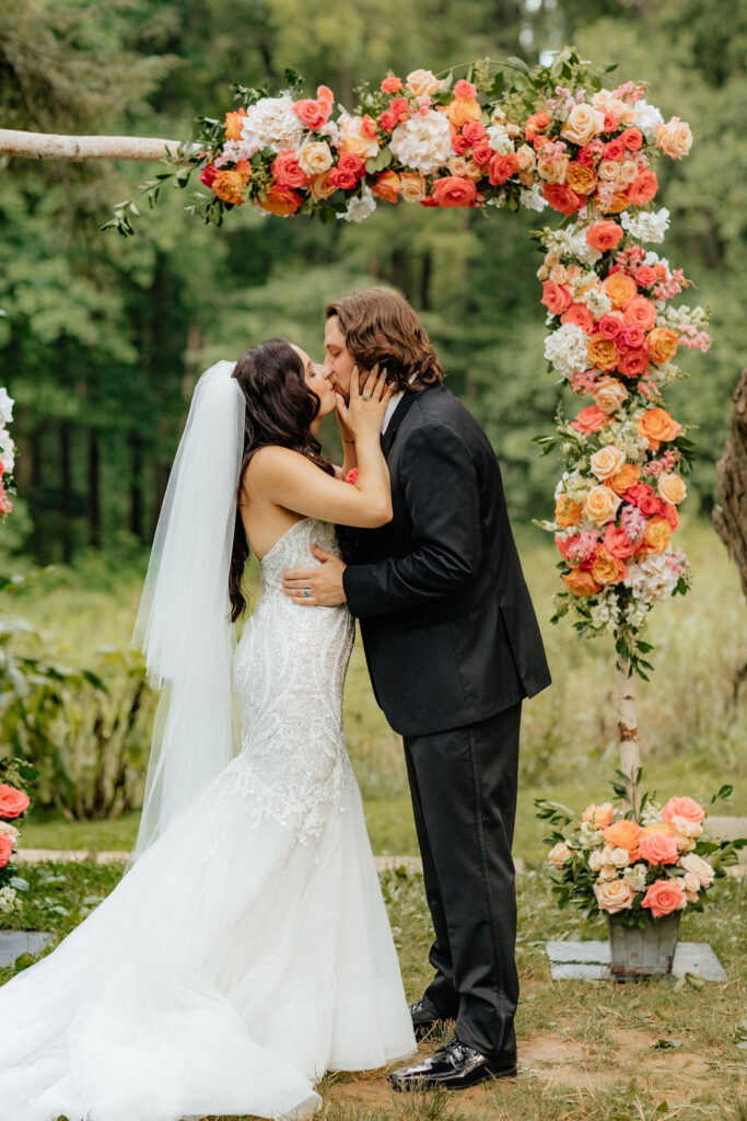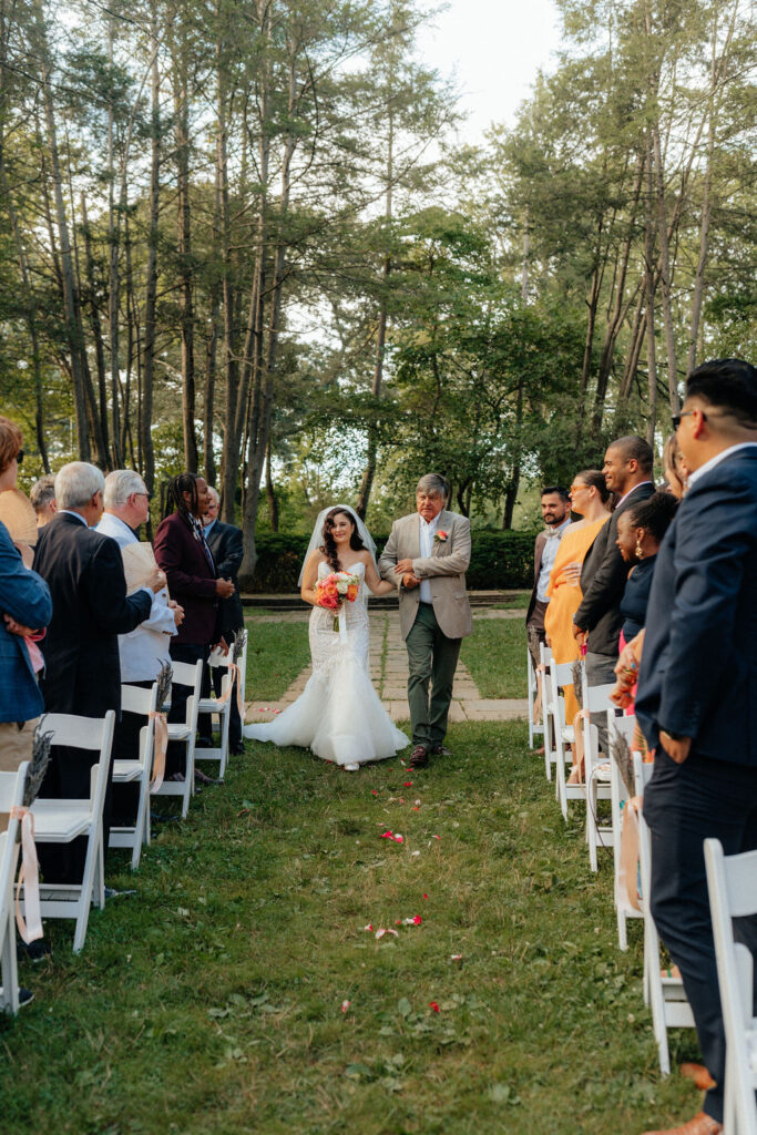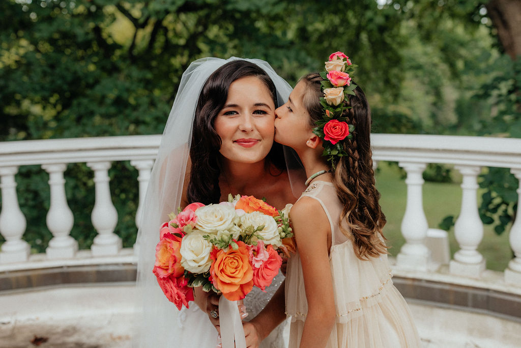 Eva and Sam’s Woodend Sanctuary & Mansion wedding was a gorgeous summer day full of friends, love, and vibrant colors. It was a hot day, but despite the changing weather outlook we were able to have the ceremony outside. The outdoor ceremony location is gorgeous among all the mature trees on the property and made for stunning photos. The bright florals in shades of pinks, whites, and oranges made their own statement while not distracting from the gorgeous grounds.